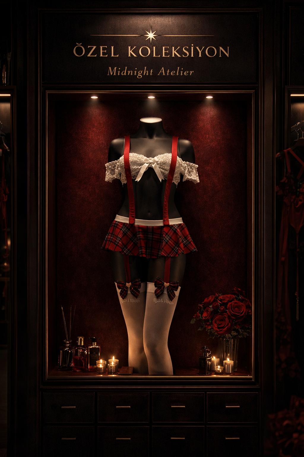 Alt bölümde bulunan mini etek formu, klasik ekose desenin modernize edilmiş haliyle tasarlanmıştır. Şarap kırmızısı ve siyah tonların derinliği sayesinde ürün, sıradan bir kostüm görünümünden çıkarak premium koleksiyon parçası hissi verir. Diz üstü çoraplar ve kurdele detayları ise bütünlüğü tamamlayarak ürüne karakter kazandırır.