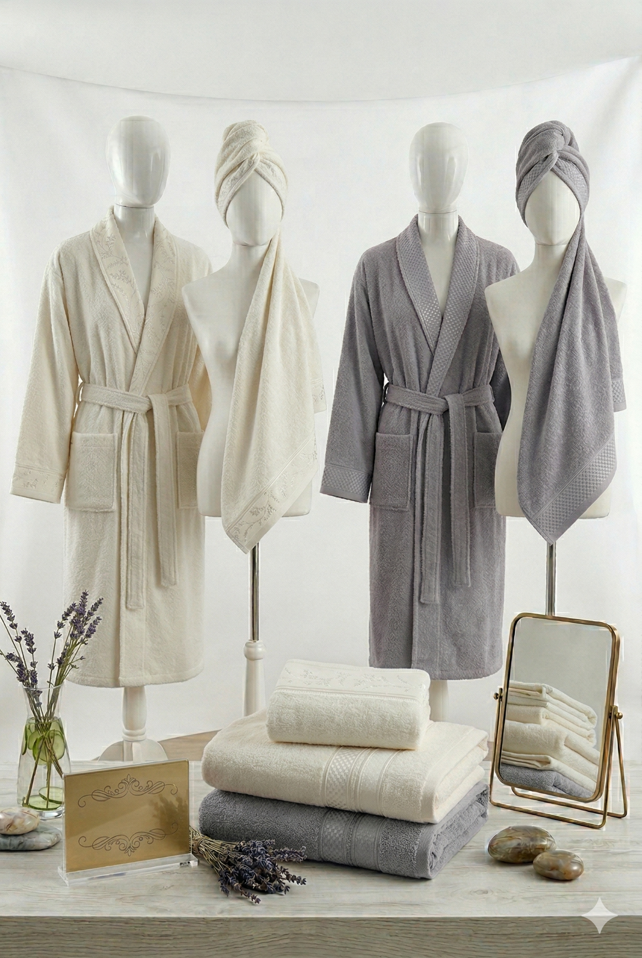 2 Adet Bornoz: Genellikle biri standart erkek (L/XL), diğeri standart kadın (S/M) kalıbında, Gri ve Krem renklerindedir.