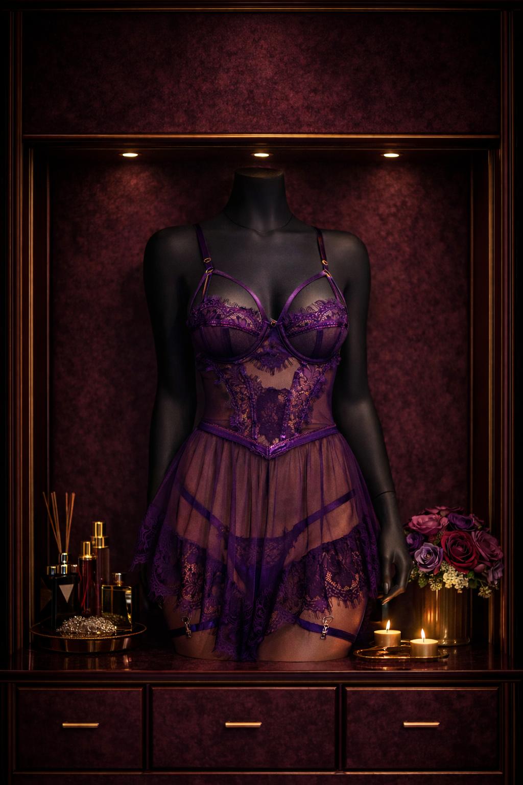 Zengin mor tonları ve ince dantel işçiliği ile tasarlanan bu özel parça, Velvet Violet – Özel Koleksiyon’un estetik ve teknik açıdan öne çıkan modellerinden biridir. Yarı transparan yapısı, form verici kesimi ve katmanlı etek tasarımı sayesinde hem görsel hem fonksiyonel bir bütünlük sunar.