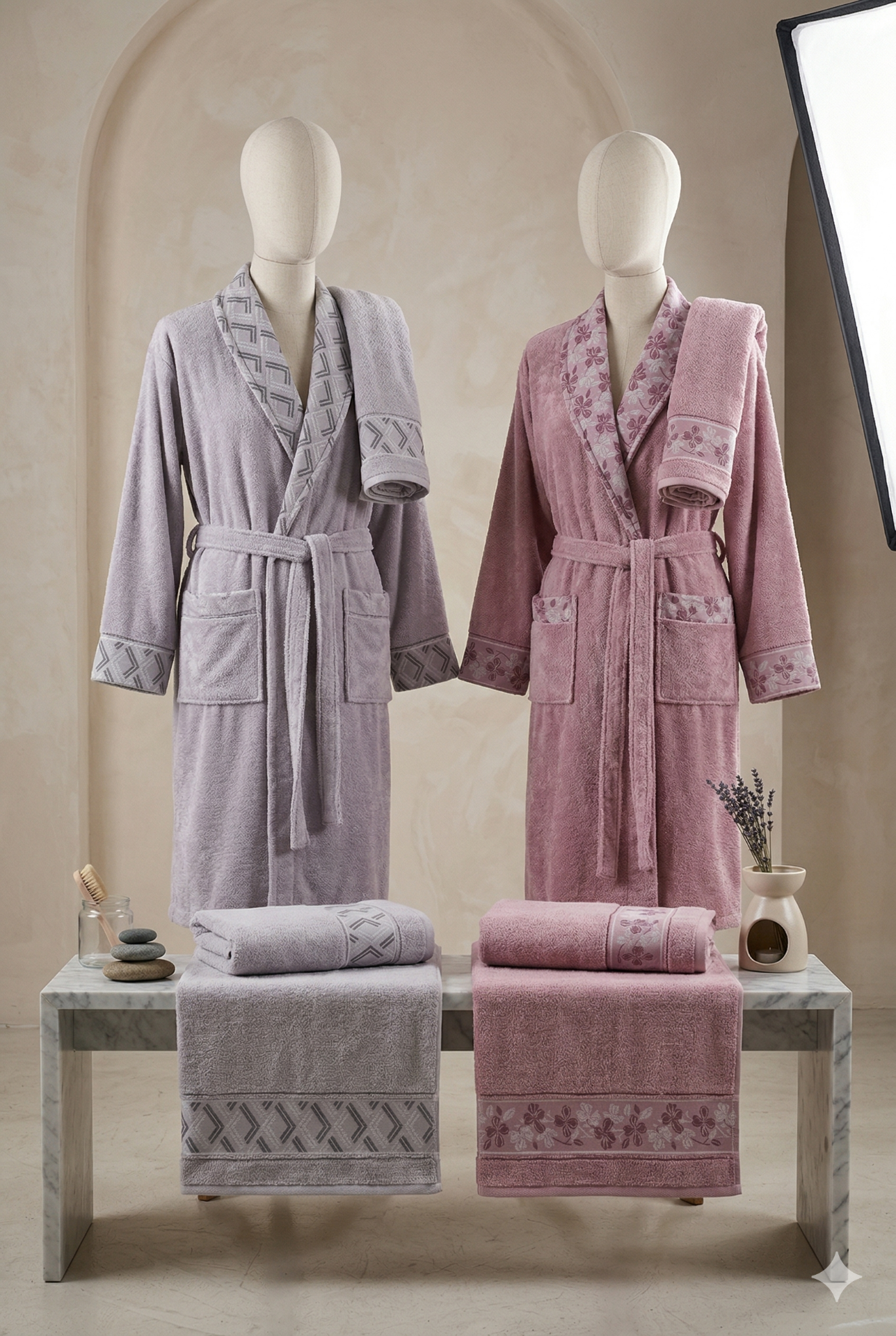 Tasarım Detayları: Bornoz yakalarında ve havlu kenarlarında Fiore serisine özel, şık floral (çiçeksi) nakış işlemeleri.